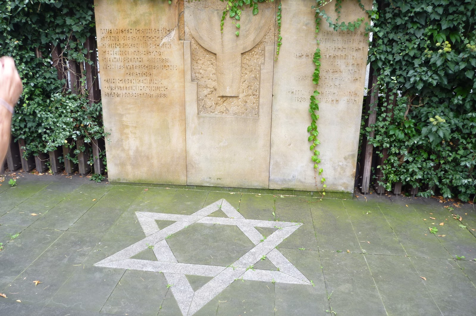 They he went to find more and returned with two bound books which turned out to be businesses from 1924 and 1927. He found Bernard Schellenberg who sold building materials, including steel, to builders and his home address. He checked and said it was no longer standing, which we already knew. But he also told us the name of the street had changed and handed us the new address. He pointed us in the direction of where the memorials are for the two synagogues that were lost during the war, so we headed there. One was Orthodox and the other more reform....my guess is Dad had his bar mitzvah at the reform, but we visited both. They're now other buildings, one a new medical center.